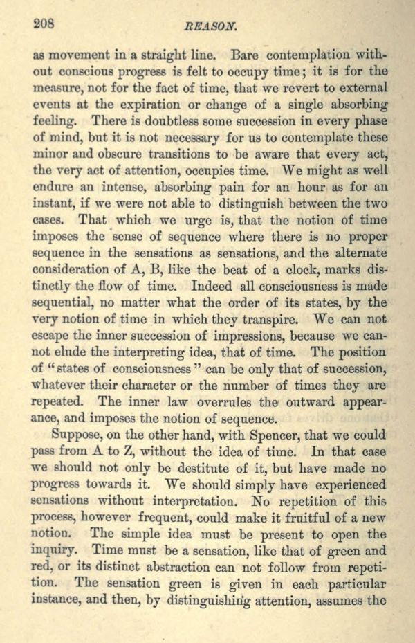 as movement in a straight line. Bare contemplation without conscious progress is felt to occupy time; it is for the measure, not for the fact of time, that we revert to external events at the expiration or change of a single absorbing feeling. There is doubtless some succession in every phase of mind, but it is not necessary for us to contemplate these minor and obscure transitions to be aware that every act, the very act of attention, occupies time. We might as well endure an intense, absorbing pain for an hour as for an instant, if we were not able to distinguish between the two cases. That which we urge is, that the notion of time imposes the sense of sequence where there is no proper sequence in the sensations as sensations, and the alternate consideration of A, B, like the beat of a clock, marks distinctly the flow of time. Indeed all consciousness is made sequential, no matter what the order of its states, by the very notion of time in which they transpire. We can not escape the inner succession of impressions, because we cannot elude the interpreting idea, that of time. The position of " states of consciousness " can be only that of succession, whatever their character or the number of times they are repeated. The inner law overrules the outward appearance, and imposes the notion of sequence.