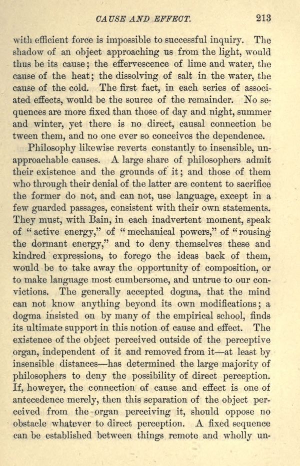 Philosophy likewise reverts constantly to insensible, unapproachable causes. A large share of philosophers admit their existence and the grounds of it; and those of them who through their denial of the latter are content to sacrifice the former do not, and can not, use language, except in a few guarded passages, consistent with their own statements. They must, with Bain, in each inadvertent moment, speak of "active energy," of "mechanical powers," of "rousing the dormant energy," and to deny themselves these and kindred expressions, to forego the ideas back of them, would be to take away the opportunity of composition, or to make language most cumbersome, and untrue to our convictions. The generally accepted dogma, that the mind can not know anything beyond its own modifications; a dogma insisted on by many of the empirical school, finds its ultimate support in this notion of cause and effect. The existence of the object perceived outside of the perceptive organ, independent of it and removed from it at least by insensible distances has determined the large majority of philosophers to deny the possibility of direct perception. If, however, the connection of cause and effect is one of antecedence merely, then this separation of the object perceived from the organ perceiving it, should oppose no obstacle whatever to direct perception. A fixed sequence can be established between things remote and wholly unlike,
