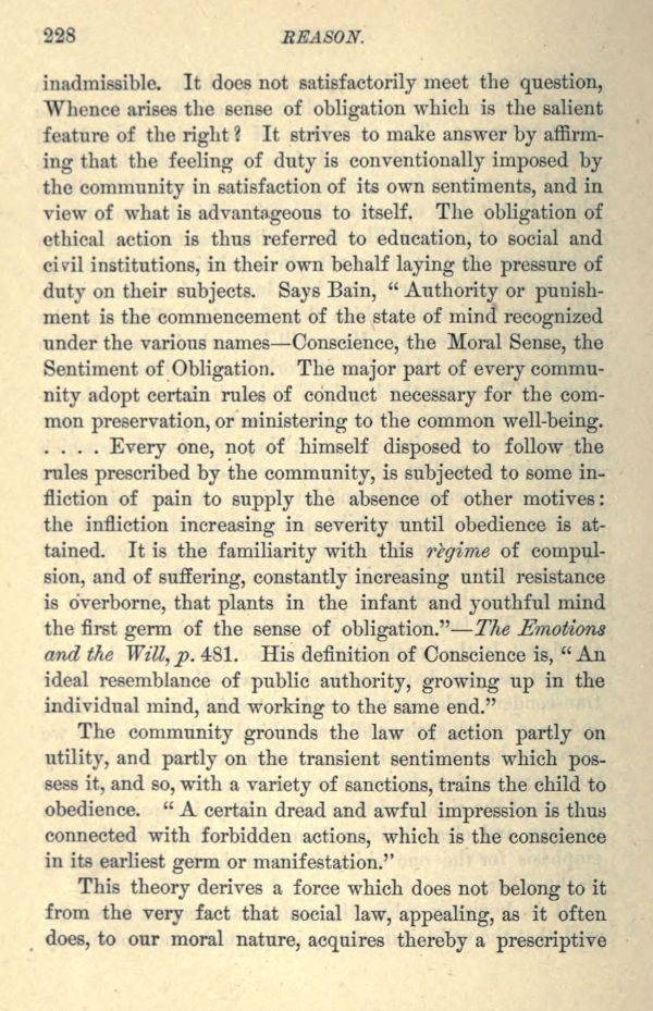 .... Every one, not of himself disposed to follow the rules prescribed by the community, is subjected to some infliction of pain to supply the absence of other motives: the infliction increasing in severity until obedience is attained. It is the familiarity with this regime of compulsion, and of suffering, constantly increasing until resistance is overborne, that plants in the infant and youthful mind the first germ of the sense of obligation." The Emotions and the Will, p. 481. His definition of Conscience is, "An ideal resemblance of public authority, growing up in the individual mind, and working to the same end."
