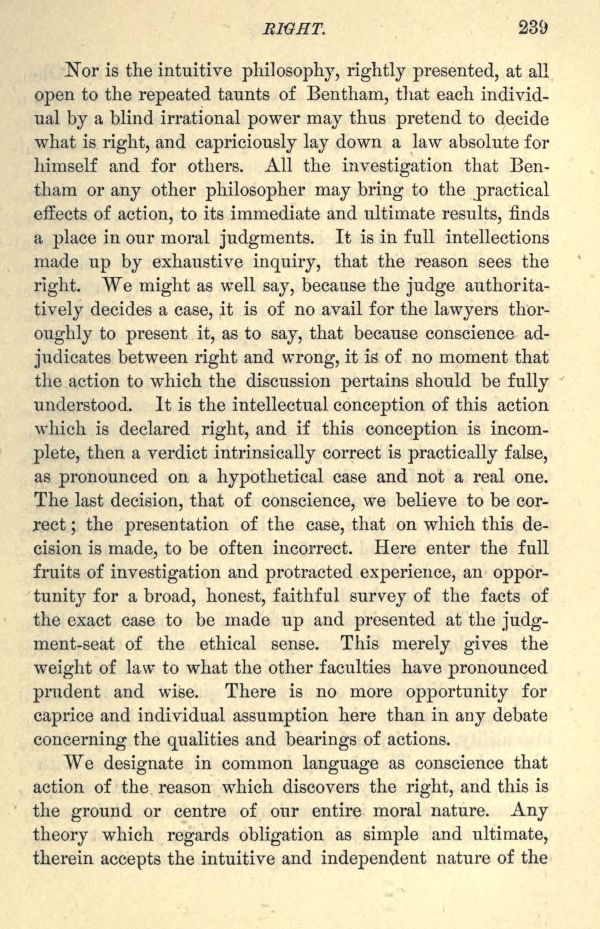 Nor is the intuitive philosophy, rightly presented, at all open to the repeated taunts of Bentham, that each individual by a blind irrational power may thus pretend to decide what is right, and capriciously lay down a law absolute for himself and for others. All the investigation that Bentham or any other philosopher may bring to the practical effects of action, to its immediate and ultimate results, finds a place in our moral judgments. It is in full intellections made up by exhaustive inquiry, that the reason sees the right. We might as well say, because the judge authoritatively decides a case, it is of no avail for the lawyers thoroughly to present it, as to say, that because conscience adjudicates between right and wrong, it is of no moment that the action to which the discussion pertains should be fully understood. It is the intellectual conception of this action which is declared right, and if this conception is incomplete, then a verdict intrinsically correct is practically false, as pronounced on a hypothetical case and not a real one. The last decision, that of conscience, we believe to be correct; the presentation of the case, that on which this decision is made, to be often incorrect. Here enter the full fruits of investigation and protracted experience, an opportunity for a broad, honest, faithful survey of the facts of the exact case to be made up and presented at the judgment-seat of the ethical sense. This merely gives the weight of law to what the other faculties have pronounced prudent and wise. There is no more opportunity for caprice and individual assumption here than in any debate concerning the qualities and bearings of actions.