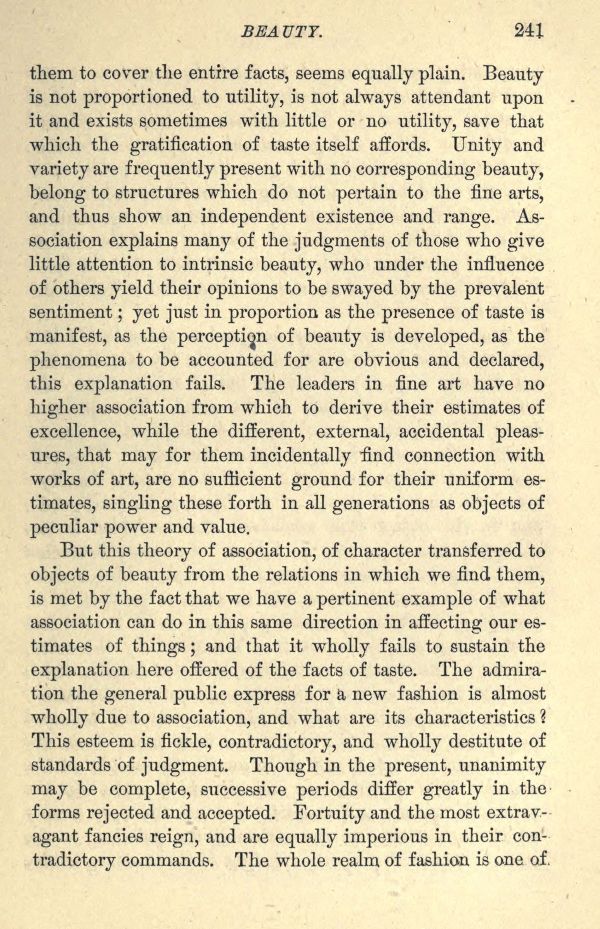 them to cover the entire facts, seems equally plain. Beauty is not proportioned to utility, is not always attendant upon it and exists sometimes with little or no utility, save that which the gratification of taste itself affords. Unity and variety are frequently present with no corresponding beauty, belong to structures which do not pertain to the fine arts, and thus show an independent existence and range. Association explains many of the judgments of those who give little attention to intrinsic beauty, who under the influence of others yield their opinions to be swayed by the prevalent sentiment; yet just in proportion as the presence of taste is manifest, as the perception of beauty is developed, as the phenomena to be accounted for are obvious and declared, this explanation fails. The leaders in fine art have no higher association from which to derive their estimates of excellence, while the different, external, accidental pleasures, that may for them incidentally find connection with works of art, are no sufficient ground for their uniform estimates, singling these forth in all generations as objects of peculiar power and value.