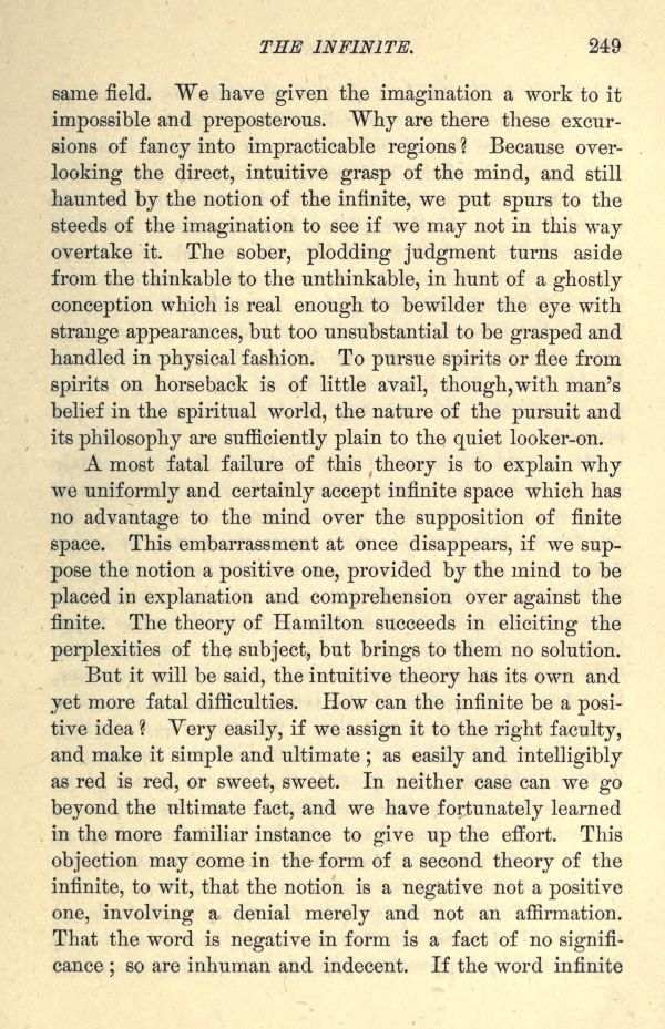 But it will be said, the intuitive theory has its own and yet more fatal difficulties. How can the infinite be a positive idea? Very easily, if we assign it to the right faculty, and make it simple and ultimate; as easily and intelligibly as red is red, or sweet, sweet. In neither case can we go beyond the ultimate fact, and we have fortunately learned in the more familiar instance to give up the effort. This objection may come in the form of a second theory of the infinite, to wit, that the notion is a negative not a positive one, involving a denial merely and not an affirmation. That the word is negative in form is a fact of no significance; so are inhuman and indecent. If the word infinite