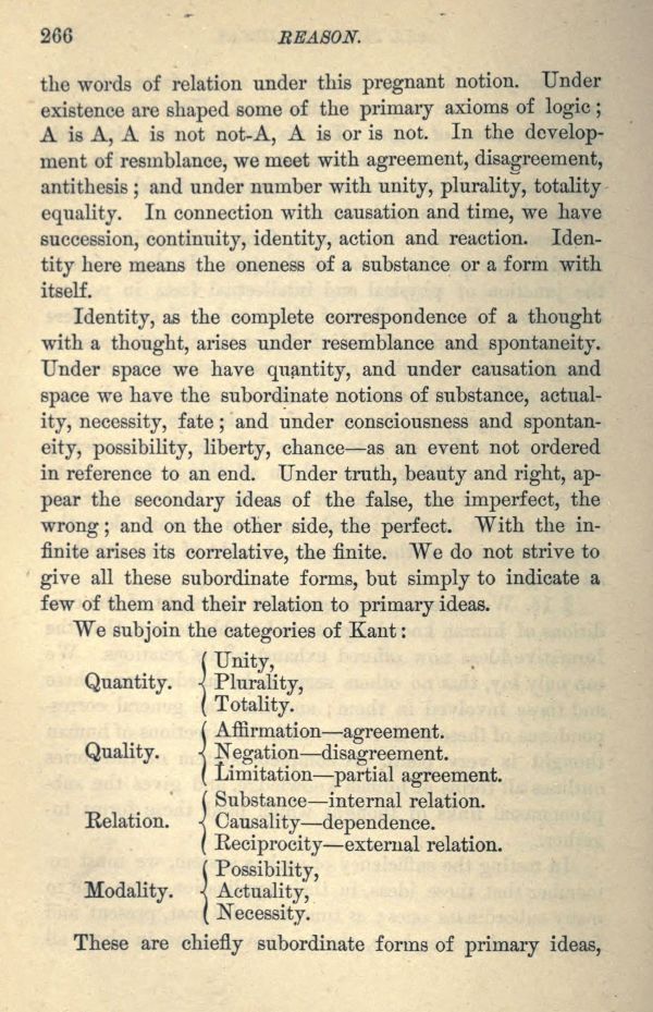 Identity, as the complete correspondence of a thought with a thought, arises under resemblance and spontaneity. Under space we have quantity, and under causation and space we have the subordinate notions of substance, actuality, necessity, fate; and under consciousness and spontaneity, possibility, liberty, chance as an event not ordered in reference to an end. Under truth, beauty and right, appear the secondary ideas of the false, the imperfect, the wrong; and on the other side, the perfect. With the infinite arises its correlative, the finite. We do not strive to give all these subordinate forms, but simply to indicate a few of them and their relation to primary ideas.