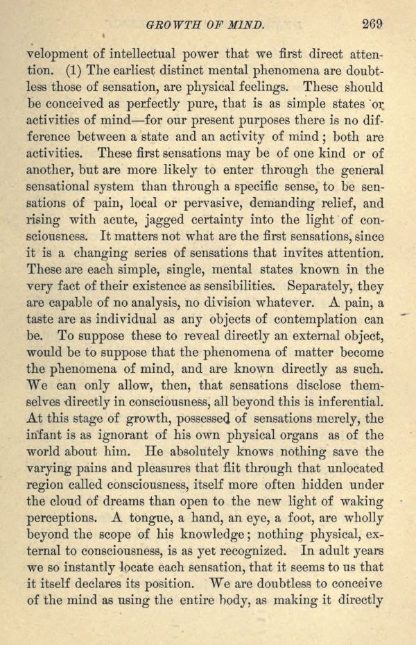 of intellectual power that we first direct attention. (1) The earliest distinct mental phenomena are doubtless those of sensation, are physical feelings. These should be conceived as perfectly pure, that is as simple states "or. activities of mind for our present purposes there is no difference between a state and an activity of mind; both are activities. These first sensations may be of one kind or of another, but are more likely to enter through the general sensational system than through a specific sense, to be sensations of pain, local or pervasive, demanding relief, and rising with acute, jagged certainty into the light of consciousness. It matters not what are the first sensations, since it is a changing series of sensations that invites attention. These are each simple, single, mental states known in the very fact of their existence as sensibilities. Separately, they are capable of no analysis, no division whatever. A pain, a taste are as individual as any objects of contemplation can be. To suppose these to reveal directly an external object, would be to suppose that the phenomena of matter become the phenomena of mind, and are known directly as such. We can only allow, then, that sensations disclose themselves -directly in consciousness, all beyond this is inferential. At this stage of growth, possessed of sensations merely, the infant is as ignorant of his own physical organs as of the world about him. He absolutely knows nothing save the varying pains and pleasures that flit through that unlocated region called consciousness, itself more often hidden under the cloud of dreams than open to the new light of waking perceptions. A tongue, a hand, an eye, a foot, are wholly beyond the scope of his knowledge; nothing physical, external to consciousness, is as yet recognized. In adult years we so instantly locate each sensation, that it seems to us that it itself declares its position. We are doubtless to conceive of the mind as using the entire body, as making it directly