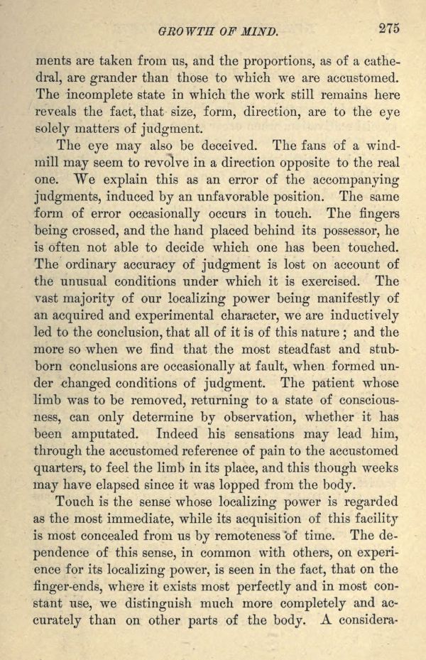 The eye may also be deceived. The fans of a windmill may seem to revolve in a direction opposite to the real one. We explain this as an error of the accompanying judgments, induced by an unfavorable position. The same form of error occasionally occurs in touch. The fingers being crossed, and the hand placed behind its possessor, he is often not able to decide which one has been touched. The ordinary accuracy of judgment is lost on account of the unusual conditions under which it is exercised. The vast majority of our localizing power being manifestly of an acquired and experimental character, we are inductively led to the conclusion, that all of it is of this nature; and the more so when we find that the most steadfast and stubborn conclusions are occasionally at fault, when formed under changed conditions of judgment. The patient whose limb was to be removed, returning to a state of consciousness, can only determine by observation, whether it has been amputated. Indeed his sensations may lead him, through the accustomed reference of pain to the accustomed quarters, to feel the limb in its place, and this though weeks may have elapsed since it was lopped from the body.