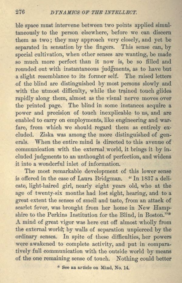 space must intervene between two points applied simultaneously to the person elsewhere, before we can discern them as two; they may approach very closely, and yet be separated in sensation by the fingers. This sense can, by special cultivation, when other senses are wanting, be made so much more perfect than it now is, be so filled and rounded out with instantaneous judgments, as to have but a slight resemblance to its former self. The raised letters of the blind are distinguished by most persons slowly and with the utmost difficulty, while the trained touch glides rapidly along them, almost as the visual nerve moves over the printed page. The blind in some instances acquire a power and precision of touch inexplicable to us, and are enabled to carry on employments, like engineering and warfare, from which we should regard them as entirely excluded. Ziska was among the more distinguished of generals. When the entire mind is directed to this avenue of communication with the external world, it brings it by included judgments to an unthought of perfection, and widens it into a wonderful inlet of information.