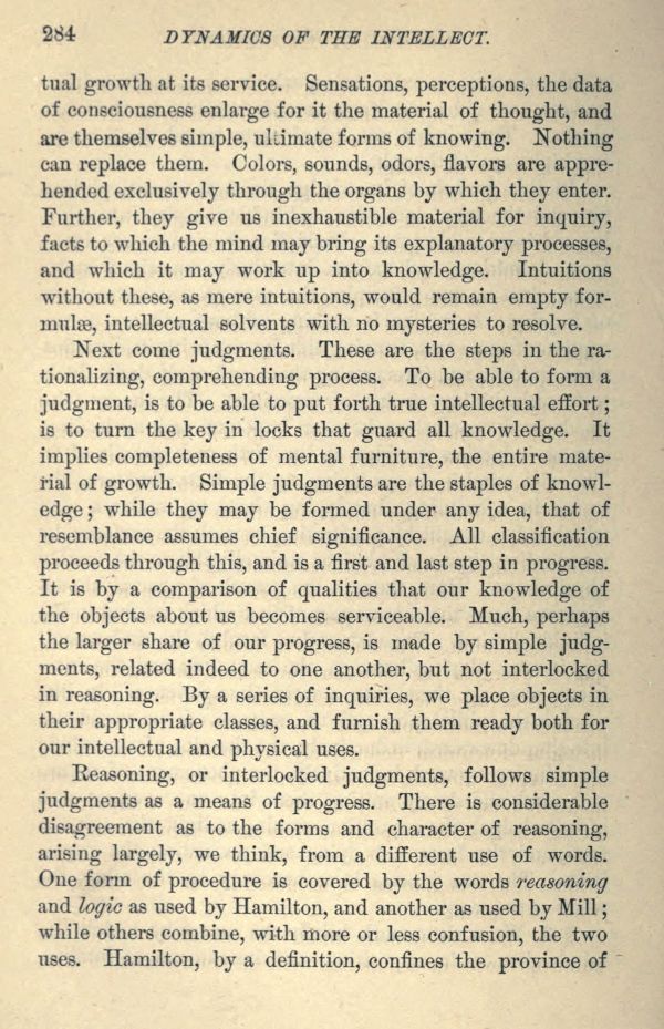 Reasoning, or interlocked judgments, follows simple judgments as a means of progress. There is considerable disagreement as to the forms and character of reasoning, arising largely, we think, from a different use of words. One form of procedure is covered by the words reasoning and logic as used by Hamilton, and another as used by Mill; while others combine, with more or less confusion, the two uses. Hamilton, by a definition, confines the province of
