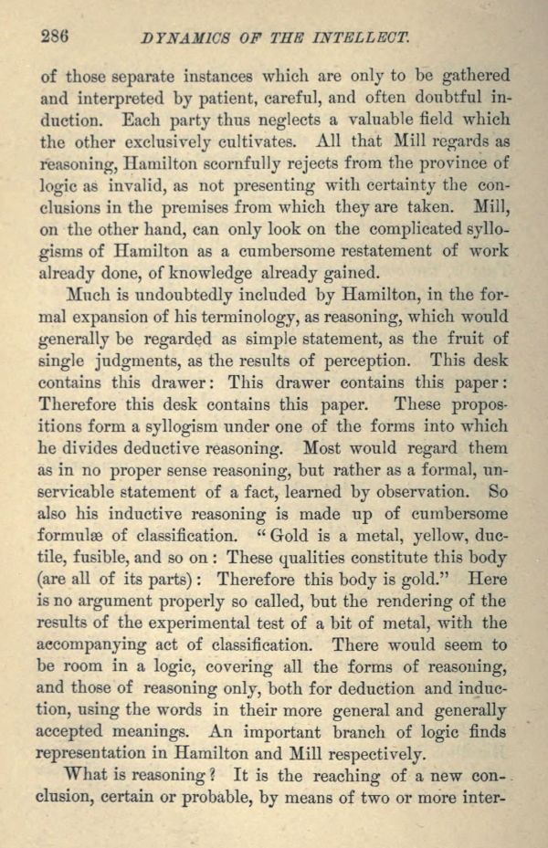 Much is undoubtedly included by Hamilton, in the formal expansion of his terminology, as reasoning, which would generally be regarded as simple statement, as the fruit of single judgments, as the results of perception. This desk contains this drawer: This drawer contains this paper: Therefore this desk contains this paper. These propositions form a syllogism under one of the forms into which he divides deductive reasoning. Most would regard them as in no proper sense reasoning, but rather as a formal, unserviceable statement of a fact, learned by observation. So also his inductive reasoning is made up of cumbersome formulae of classification. "Gold is a metal, yellow, ductile, fusible, and so on: These qualities constitute this body (are all of its parts): Therefore this body is gold." Here is no argument properly so called, but the rendering of the results of the experimental test of a bit of metal, with the accompanying act of classification. There would seem to be room in a logic, covering all the forms of reasoning, and those of reasoning only, both for deduction and induction, using the words in their more general and generally accepted meanings. An important branch of logic finds representation in Hamilton and Mill respectively.
