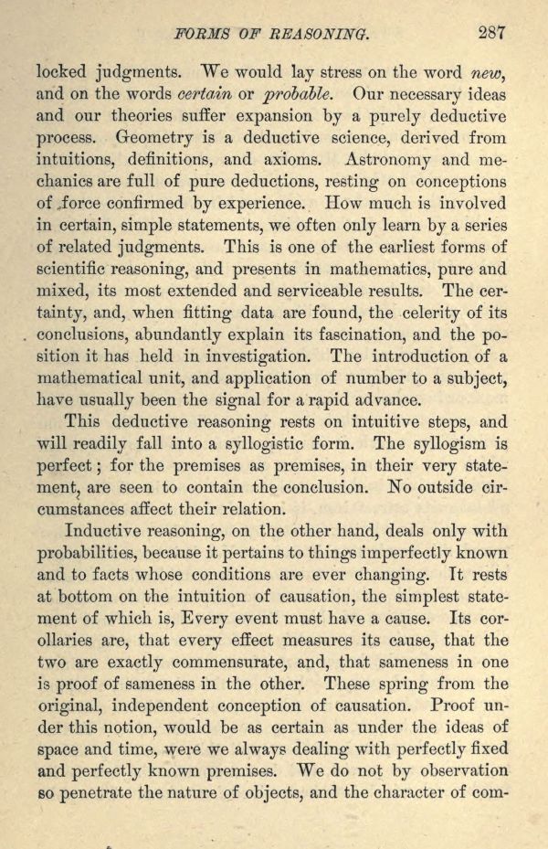 Inductive reasoning, on the other hand, deals only with probabilities, because it pertains to things imperfectly known and to facts whose conditions are ever changing. It rests at bottom on the intuition of causation, the simplest statement of which is, Every event must have a cause. Its corollaries are, that every effect measures its cause, that the two are exactly commensurate, and, that sameness in one is proof of sameness in the other. These spring from the original, independent conception of causation. Proof under this notion, would be as certain as under the ideas of space and time, were we always dealing with perfectly fixed and perfectly known premises. We do not by observation so penetrate the nature of objects, and the character of complex