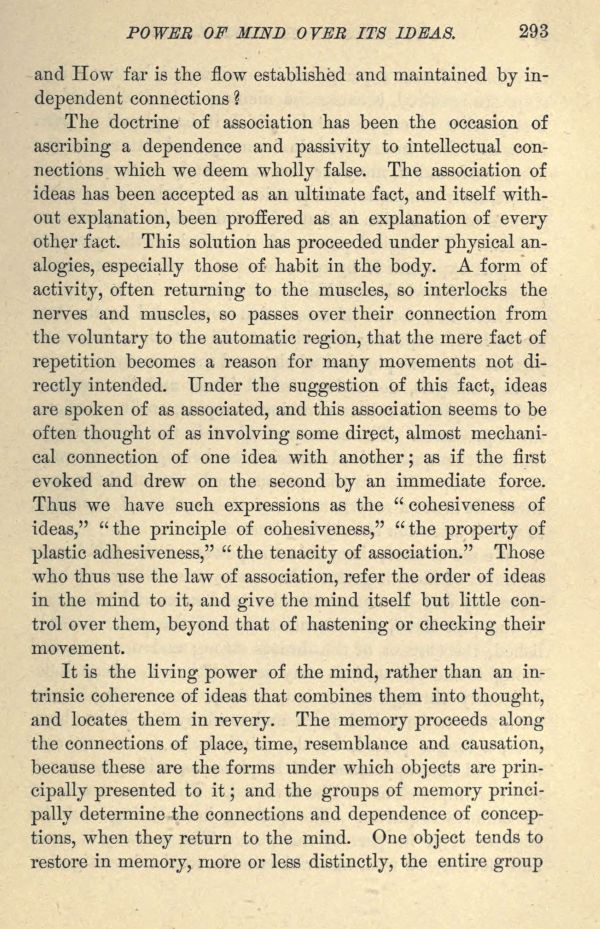 The doctrine of association has been the occasion of ascribing a dependence and passivity to intellectual connections which we deem wholly false. The association of ideas has been accepted as an ultimate fact, and itself without explanation, been proffered as an explanation of every other fact. This solution has proceeded under physical analogies, especially those of habit in the body. A form of activity, often returning to the muscles, so interlocks the nerves and muscles, so passes over their connection from the voluntary to the automatic region, that the mere fact of repetition becomes a reason for many movements not directly intended. Under the suggestion of this fact, ideas are spoken of as associated, and this association seems to be often thought of as involving some direct, almost mechanical connection of one idea with another; as if the first evoked and drew on the second by an immediate force. Thus we have such expressions as the " cohesiveness of ideas," " the principle of cohesiveness," " the property of plastic adhesiveness," " the tenacity of association." Those who thus use the law of association, refer the order of ideas in the mind to it, and give the mind itself but little control over them, beyond that of hastening or checking their movement.