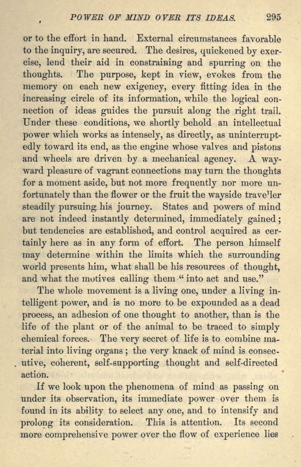 or to the effort in hand. External circumstances favorable to the inquiry, are secured. The desires, quickened by exercise, lend their aid in constraining and spurring on the thoughts. The purpose, kept in view, evokes from the memory on each new exigency, every fitting idea in the increasing circle of its information, while the logical connection of ideas guides the pursuit along the right trail. Under these conditions, we shortly behold an intellectual power which works as intensely, as directly, as uninterruptedly toward its end, as the engine whose valves and pistons and wheels are driven by a mechanical agency. A wayward pleasure of vagrant connections may turn the thoughts for a moment aside, but not more frequently nor more unfortunately than the flower or the fruit the wayside traveler steadily pursuing his journey. States and powers of mind are not indeed instantly determined, immediately gained; but tendencies are established, and control acquired as certainly here as in any form of effort. The person himself may determine within the limits which the surrounding world presents him, what shall be his resources of thought, and what the motives calling them "into act and use."