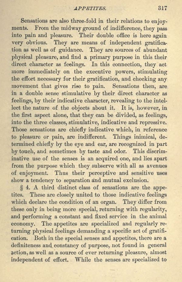 4. A third distinct class of sensations are the appetites. These are closely united to those indicative feelings which declare the condition of an organ. They differ from these only in being more special, returning with regularity, and performing a constant and fixed service in the animal economy. The appetites are specialized and regularly returning physical feelings demanding a specific act of gratification. Both in the special senses and appetites, there are a definiteness and constancy of purpose, not found in general action, as well as a source of ever returning pleasure, almost independent of effort. While the senses are specialized to