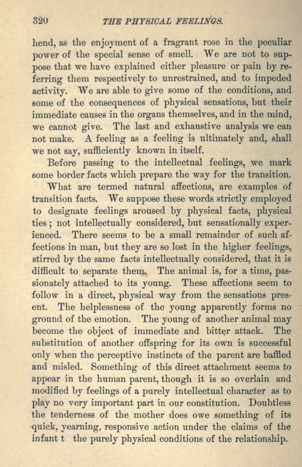 What are termed natural affections, are examples of transition facts. We suppose these words strictly employed to designate feelings aroused by physical facts, physical ties; not intellectually considered, but sensationally experienced. There seems to be a small remainder of such affections in man, but they are so lost in the higher feelings, stirred by the same facts intellectually considered, that it is difficult to separate them. The animal is, for a time, passionately attached to its young. These affections seem to follow in a direct, physical way from the sensations present. The helplessness of the young apparently forms no ground of the emotion. The young of another animal may become the object of immediate and bitter attack. The substitution of another offspring for its own is successful only when the perceptive instincts of the parent are baffled and misled. Something of this direct attachment seems to appear in the human parent, though it is so overlain and modified by feelings of a purely intellectual character as to play no very important part in our constitution. Doubtless the tenderness of the mother does owe something of its quick, yearning, responsive action under the claims of the infant t the purely physical conditions of the relationship.