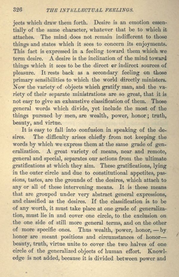 It is easy to fall into confusion in speaking of the desires. The difficulty arises chiefly from not keeping the words by which we express them at the same grade of generalization. A great variety of means, near and remote, general and special, separates our actions from the ultimate gratifications at which they aim. These gratifications, lying in the outer circle and due to constitutional appetites, passions, tastes, are the grounds of the desires, which attach to any or all of these intervening means. It is these means that are grouped under very abstract general expressions, and classified as the desires. If the classification is to be of any worth, it must take place at one grade of generalization, must lie in and cover one circle, to the exclusion on the one side of still more general terms, and on the other of more specific ones. Thus wealth, power, honor, by honor are meant positions and circumstances of honor beauty, truth, virtue unite to cover the two halves of one circle of the generalized objects of human effort. Knowledge is not added, because it is divided between power and