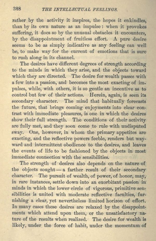 The strength of desires also depends on the nature of the objects sought a farther result of their secondary character. The pursuit of wealth, of power, of honor, may, in rare instances, settle down into an exorbitant passion in minds in which the lower circle of vigorous, primitive sensibilities is united with moderate reflective faculties, furnishing a clear, yet nevertheless limited horizon of effort. In many cases these desires are relaxed by the disappointments which attend upon them, or the unsatisfactory nature of the results when realized. The desire for wealth is likely, under the force of habit, under the momentum of