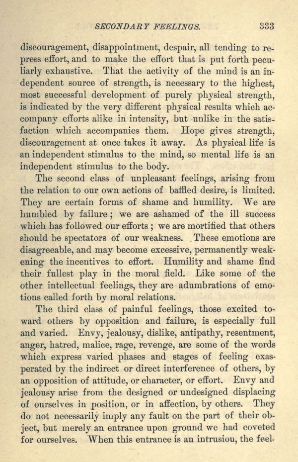 The second class of unpleasant feelings, arising from the relation to our own actions of baffled desire, is limited. They are certain forms of shame and humility. We are humbled by failure; we are ashamed of the ill success which has followed our efforts; we are mortified that others should be spectators of our weakness. These emotions are disagreeable, and may become excessive, permanently weakening the incentives to effort. Humility and shame find their fullest play in the moral field. Like some of the other intellectual feelings, they are adumbrations of emotions called forth by moral relations.