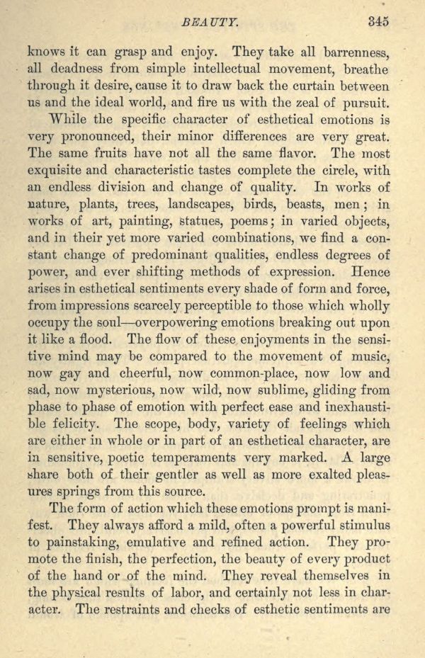 The form of action which these emotions prompt is manifest. They always afford a mild, often a powerful stimulus to painstaking, emulative and refined action. They promote the finish, the perfection, the beauty of every product of the hand or of the mind. They reveal themselves in the physical results of labor, and certainly not less in character. The restraints and checks of esthetic sentiments are