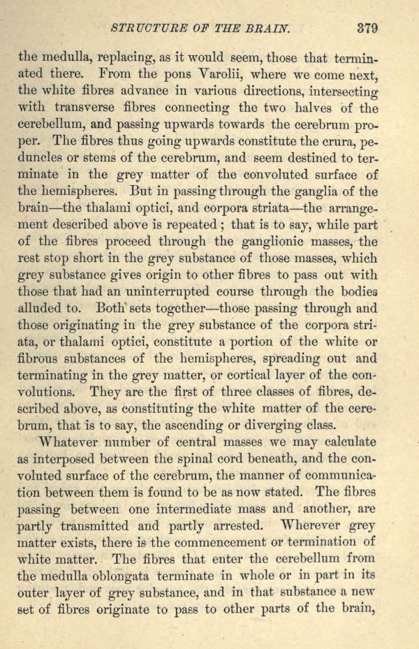 the medulla, replacing, as it would seem, those that terminated there. From the pons Yarolii, where we come next, the white fibres advance in various directions, intersecting with transverse fibres connecting the two halves of the cerebellum, and passing upwards towards the cerebrum proper. The fibres thus going upwards constitute the crura, peduncles or stems of the cerebrum, and seem destined to terminate in the grey matter of the convoluted surface of the hemispheres. But in passing through the ganglia of the brain the thalami optici, and corpora striata the arrangement described above is repeated; that is to say, while part of the fibres proceed through the ganglionic masses, the rest stop short in the grey substance of those masses, which grey substance gives origin to other fibres to pass out with those that had an uninterrupted course through the bodies alluded to. Both sets together those passing through and those originating in the grey substance of the corpora striata, or thalami optici, constitute a portion of the white or fibrous substances of the hemispheres, spreading out and terminating in the grey matter, or cortical layer of the convolutions. They are the first of three classes of fibres, described above, as constituting the white matter of the cerebrum, that is to say, the ascending or diverging class.