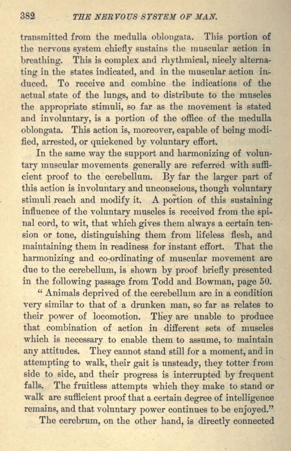 "Animals deprived of the cerebellum are in a condition very similar to that of a drunken man, so far as relates to their power of locomotion. They are unable to produce that combination of action in different sets of muscles which is necessary to enable them to assume, to maintain any attitudes. They cannot stand still for a moment, and in attempting to walk, their gait is unsteady, they totter from side to side, and their progress is interrupted by frequent falls. The fruitless attempts which they make to stand or walk are sufficient proof that a certain degree of intelligence remains, and that voluntary power continues to be enjoyed."