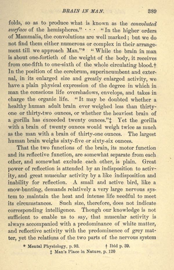 In the position of the cerebrum, superincumbent and external, in its enlarged size and greatly enlarged activity, we have a plain physical expression of the degree in which in man the conscious life overshadows, envelops, and takes in charge the organic life. "It may be doubted whether a healthy human adult brain ever weighed less than thirty one or thirty-two ounces, or whether the heaviest brain of a gorilla has exceeded twenty ounces."^ Yet the gorilla with a brain of twenty ounces would weigh twice as much as the man with a brain of thirty-one ounces. The largest human brain weighs sixty-five or sixty-six ounces.