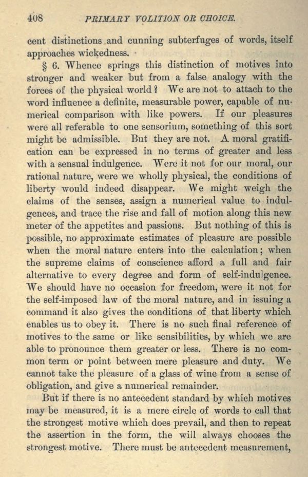 6. Whence springs this distinction of motives into stronger and weaker but from a false analogy with the forces of the physical world? "We are not to attach to the word influence a definite, measurable power, capable of numerical comparison with like powers. If our pleasures were all referable to one sensorium, something of this sort might be admissible. But they are not. A moral gratification can be expressed in no terms of greater and less with a sensual indulgence. Were it not for our moral, our rational nature, were we wholly physical, the conditions of liberty would indeed disappear. We might weigh the claims of the senses, assign a numerical value to indulgences, and trace the rise and fall of motion along this new meter of the appetites and passions. But nothing of this is possible, no approximate estimates of pleasure are possible when the moral nature enters into the calculation; when the supreme claims of conscience afford a full and fair alternative to every degree and form of self-indulgence. We should have no occasion for freedom, were it not for the self-imposed law of the moral nature, and in issuing a command it also gives the conditions of that liberty which enables us to obey it. There is no such final reference of motives to the same or like sensibilities, by which we are able to pronounce them greater or less. There is no common term or point between mere pleasure and duty. We cannot take the pleasure of a glass of wine from a sense of obligation, and give a numerical remainder.