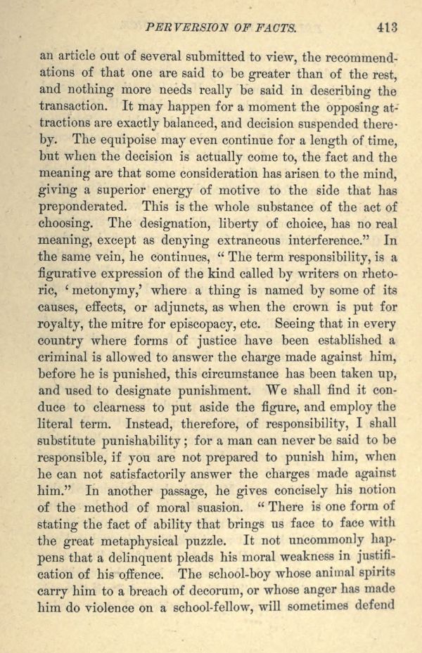 an article out of several submitted to view, the recommendations of that one are said to be greater than of the rest, and nothing more needs really be said in describing the transaction. It may happen for a moment the opposing attractions are exactly balanced, and decision suspended thereby. The equipoise may even continue for a length of time, but when the decision is actually come to, the fact and the meaning are that some consideration has arisen to the mind, giving a superior energy of motive to the side that has preponderated. This is the whole substance of the act of choosing. The designation, liberty of choice, has no real meaning, except as denying extraneous interference." In the same vein, he continues, " The term responsibility, is a figurative expression of the kind called by writers on rhetoric, ' metonymy,' where a thing is named by some of its causes, effects, or adjuncts, as when the crown is put for royalty, the mitre for episcopacy, etc. Seeing that in every country where forms of justice have been established a criminal is allowed to answer the charge made against him, before he is punished, this circumstance has been taken up, and used to designate punishment. We shall find it conduce to clearness to put aside the figure, and employ the literal term. Instead, therefore, of responsibility, I shall substitute punishability; for a man can never be said to be responsible, if you are not prepared to punish him, when he can not satisfactorily answer the charges made against him." In another passage, he gives concisely his notion of the method of moral suasion. " There is one form of stating the fact of ability that brings us face to face with the great metaphysical puzzle. It not uncommonly happens that a delinquent pleads his moral weakness in justification of his offence. The school-boy whose animal spirits carry him to a breach of decorum, or whose anger has made him do violence on a school-fellow, will sometimes defend