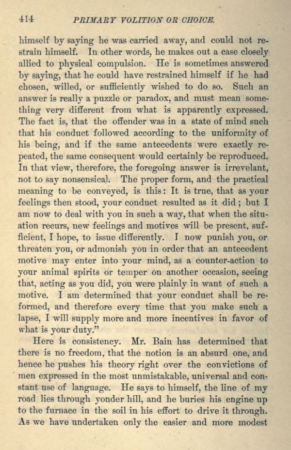 himself by saying lie was carried away, and could not restrain himself. In other words, he makes out a case closely allied to physical compulsion. He is sometimes answered by saying, that he could have restrained himself if he had chosen, willed, or sufficiently wished to do so. Such an answer is really a puzzle or paradox, and must mean something very different from what is apparently expressed. The fact is, that the offender was in a state of mind such that his conduct followed according to the uniformity of his being, and if the same antecedents were exactly repeated, the same consequent would certainly be reproduced. In that view, therefore, the foregoing answer is irrelevant, not to say nonsensical. The proper form, and the practical meaning to be conveyed, is this: It is true, that as your feelings then stood, your conduct resulted as it did; but I am now to deal with you in such a way, that when the situation recurs, new feelings and motives will be present, sufficient, I hope, to issue differently. I now punish you, or threaten you, or admonish you in order that an antecedent motive may enter into your mind, as a counter-action to your animal spirits or temper on another occasion, seeing that, acting as you did, you were plainly in want of such a motive. I am determined that your conduct shall be reformed, and therefore every time that you make such a lapse, I will supply more and more incentives in favor of what is your duty."