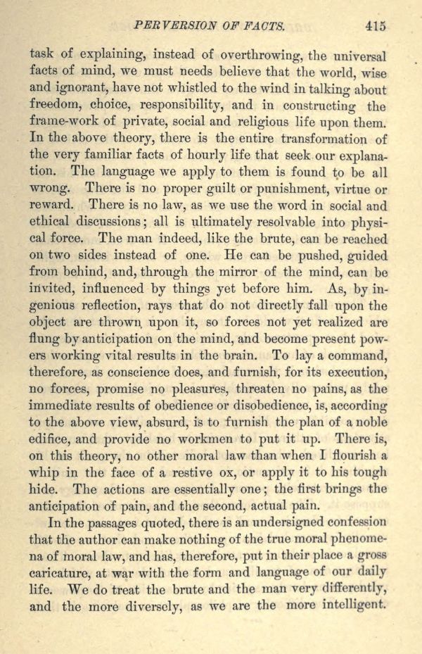 task of explaining, instead of overthrowing, the universal facts of mind, we must needs believe that the world, wise and ignorant, have not whistled to the wind in talking about freedom, choice, responsibility, and in constructing the frame-work of private, social and religious life upon them. In the above theory, there is the entire transformation of the very familiar facts of hourly life that seek our explanation. The language we apply to them is found to be all wrong. There is no proper guilt or punishment, virtue or reward. There is no law, as we use the word in social and ethical discussions; all is ultimately resolvable into physical force. The man indeed, like the brute, can be reached on two sides instead of one. He can be pushed, guided from behind, and, through the mirror of the mind, can be invited, influenced by things yet before him. As, by ingenious reflection, rays that do not directly fall upon the object are thrown, upon it, so forces not yet realized are flung by anticipation on the mind, and become present powers working vital results in the brain. To lay a command, therefore, as conscience does, and furnish, for its execution, no forces, promise no pleasures, threaten no pains, as the immediate results of obedience or disobedience, is, according to the above view, absurd, is to furnish the plan of a noble edifice, and provide no workmen to put it up. There is, on this theory, no other moral law than when I flourish a whip in the face of a restive ox, or apply it to his tough hide. The actions are essentially one; the first brings the anticipation of pain, and the second, actual pain.