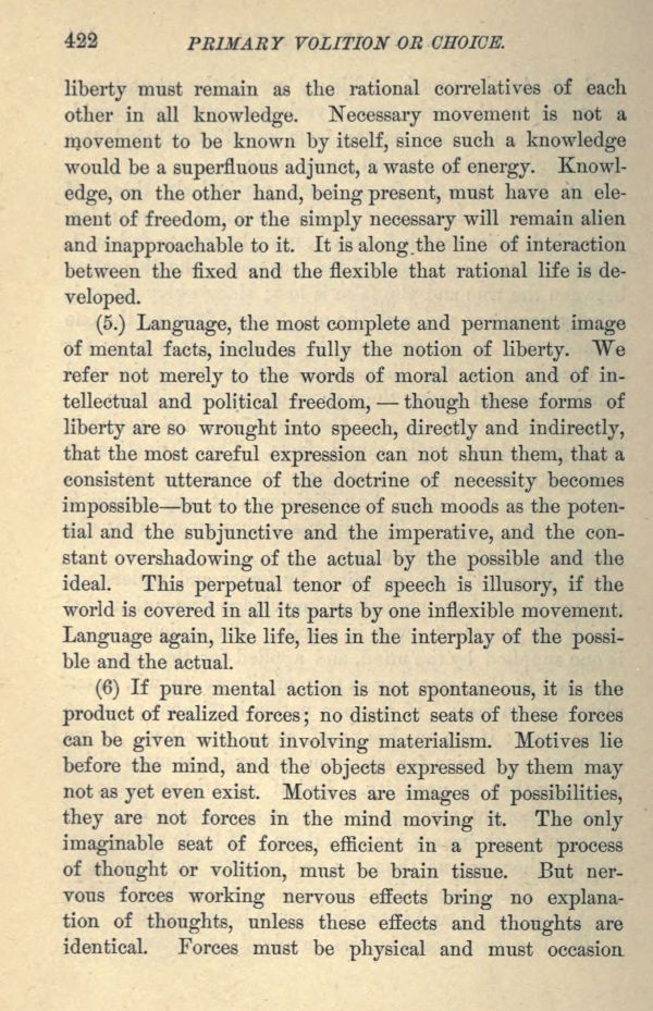 (5.) Language, the most complete and permanent image of mental facts, includes fully the notion of liberty. "We refer not merely to the words of moral action and of intellectual and political freedom, though these forms of liberty are so wrought into speech, directly and indirectly, that the most careful expression can not shun them, that a consistent utterance of the doctrine of necessity becomes impossible but to the presence of such moods as the potential and the subjunctive and the imperative, and the constant overshadowing of the actual by the possible and the ideal. This perpetual tenor of speech is illusory, if the world is covered in all its parts by one inflexible movement. Language again, like life, lies in the interplay of the possible and the actual.