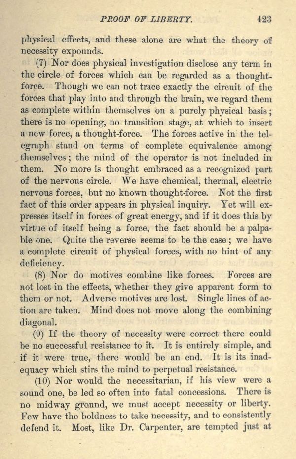 (7) Nor does physical investigation disclose any term in the circle of forces which can be regarded as a thought-force. Though we can not trace exactly the circuit of the forces that play into and through the brain, we regard them as complete within themselves on a purely physical basis; there is no opening, no transition stage, at which to insert a new force, a thought-force. The forces active in the telegraph stand on terms of complete equivalence among themselves; the mind of the operator is not included in them. No more is thought embraced as a recognized part of the nervous circle. We have chemical, thermal, electric nervous forces, but no known thought-force. Not the first fact of this order appears in physical inquiry. Yet will expresses itself in forces of great energy, and if it does this by virtue of itself being a force, the fact should be a palpable one. Quite the reverse seems to be the case; we have a complete circuit of physical forces, with no hint of any deficiency.