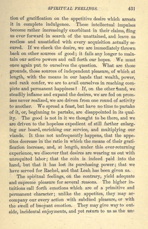 of gratification on the appetitive desire which arrests it in complete indulgence. These intellectual impulses become rather increasingly exorbitant in their claims, fling us ever forward in search of the unattained, and leave us restless and unsatisfied with every acquisition actually secured. If we check the desire, we are immediately thrown back on other sources of good; it fails any longer to maintain our active powers and call forth our hopes. We must once again put to ourselves the question. "What are those grounds, those sources of independent pleasure, of which at length, with the means in our hands that wealth, power, and rank confer, we are to avail ourselves in reaching complete and permanent happiness? If, on the other hand, we steadily inflame and expand the desires, we' are fed on promises never realized, we are driven from one round of activity to another. We spread a feast, but have no time to partake of it, or, beginning to partake, are disappointed in its quality. The good is not in it we thought to be there, and we are driven to the hopeless expedient of still farther enlarging our board, enriching our service, and multiplying our viands. It thus not unfrequently happens, that the appetites decrease in the ratio in which the means of their gratification increase, and, at length, under this ever-returning experience, we discover that desires are wearing us out with unrequited labor; that the coin is indeed paid into the hand, but that it has lost its purchasing power; that we have served for Rachel, and that Leah has been given us.