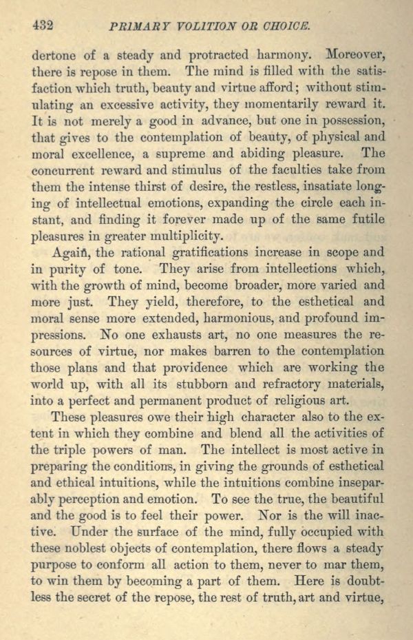 of a steady and protracted harmony. Moreover, there is repose in them. The mind is filled with the satisfaction which truth, beauty and virtue afford; without stimulating an excessive activity, they momentarily reward it. It is not merely a good in advance, but one in possession, that gives to the contemplation of beauty, of physical and moral excellence, a supreme and abiding pleasure. The concurrent reward and stimulus of the faculties take from them the intense thirst of desire, the restless, insatiate longing of intellectual emotions, expanding the circle each instant, and finding it forever made up of the same futile pleasures in greater multiplicity.