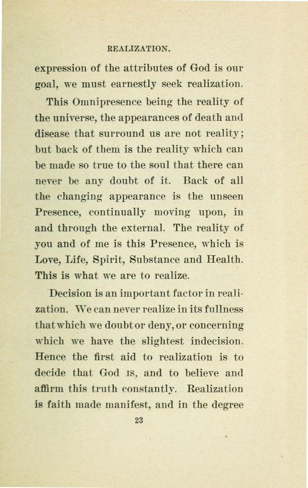 Decision is an important factor in realization. We can never realize in its fullness that which we doubt or deny, or concerning which we have the slightest indecision. Hence the first aid to realization is to decide that God is, and to believe and affirm this truth constantly. Realization is faith made manifest, and in the degree