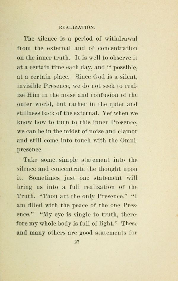 The silence is a period of withdrawal from the external and of concentration on the inner truth. It is well to observe it at a certain time each day, and if possible, at a certain place. Since God is a silent, invisible Presence, we do not seek to realize Him in the noise and confusion of the outer world, but rather in the quiet and stillness back of the external. Yet when we know how to turn to this inner Presence, we can be in the midst of noise and clamor and still come into touch with the Omnipresence.
