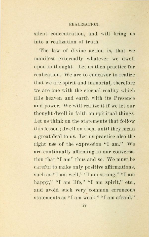 The law of divine action is, that we manifest externally whatever we dwell upon in thought. Let us then practice for realization. We are to endeavor to realize that we are spirit and immortal, therefore we are one with the eternal reality which fills heaven and earth with its Presence and power. We will realize it if we let our thought dwell in faith on spiritual things. Let us think on the statements that follow this lesson dwell on them until they mean a great deal to us. Let us practice also the right use of the expression "I am." We are continually affirming in our conversation that "I am" thus and so. We must be careful to make only positive affirmations, such as "I am well," "I am strong," "I am happy," "I am life," "I am spirit," etc., and avoid such very... common erroneous statements as "I am weak," "I am afraid,"