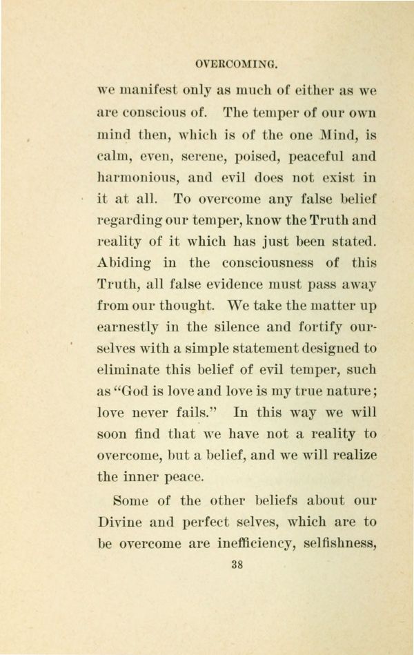 we manifest only as much of either as we are conscious of. The temper of our own mind then, which is of the one Mind, is calm, even, serene, poised, peaceful and harmonious, and evil does not exist in it at all. To overcome any false belief regarding our temper, know the Truth and reality of it which has just been stated. Abiding in the consciousness of this Truth, all false evidence must pass away from our thought. We take the matter up earnestly in the silence and fortify ourselves with a simple statement designed to eliminate this belief of evil temper, such as "God is love and love is my true nature love never fails." In this way we will soon find that we have not a reality to overcome, but a belief, and we will realize the inner peace.
