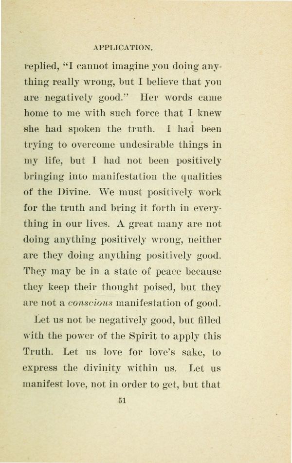 replied, "I cannot imagine you doing anything really wrong, but I believe that you are negatively good." Her words came home to me with such force that I knew she had spoken the truth. I had been trying to overcome undesirable things in my life, but I had not been positively bringing into manifestation the qualities of the Divine. We must positively work for the truth and bring it forth in everything in our lives. A great many are not doing anything positively wrong, neither are they doing anything positively good. They may be in a state of peace because they keep their thought poised, but they are not a conscious manifestation of good.