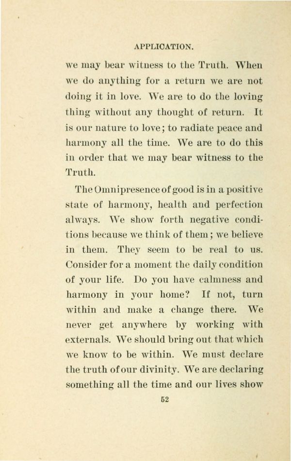 Contents - Omnipresence - Realization - Overcoming - Application - Helping Others - Rules of Action - Thought - The Word - Healing - Non-Resistance - Supply - Service in Love - Joy - Spiritual Guidance - Living the Life - Guidance for Realization - Suggestions from Nona L. Brooks - Leave It With Him - An Inward Stillness - In the Rush - Where Shall I Sow My Seed? - Words of Love - Three Gates of Gold - Loyalty