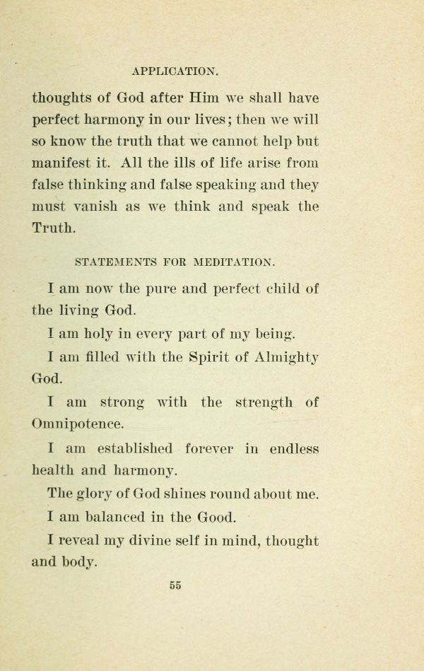 thoughts of God after Him we shall have perfect harmony in our lives; then we will so know the truth that we cannot help but manifest it. All the ills of life arise from false thinking and false speaking and they must vanish as we think and speak the Truth.