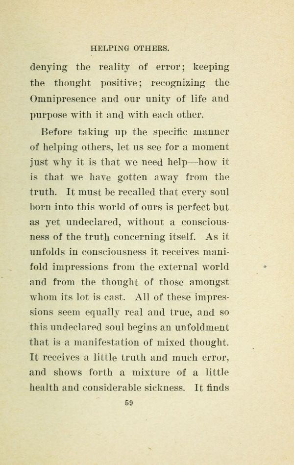 Before taking up the specific manner of helping others, let us see for a moment just why it is that we need help --- how it is that we have gotten away from the truth. It must be recalled that every soul born into this world of ours is perfect but as yet undeclared, without a consciousness of the truth concerning itself. As it unfolds in consciousness it receives manifold impressions from the external world and from the thought of those amongst whom its lot is cast. All of these impressions seem equally real and true, and so this undeclared soul begins an unfoldment that is a manifestation of mixed thought. It receives a little truth and much error, and shows forth a mixture of a little health and considerable sickness. It finds