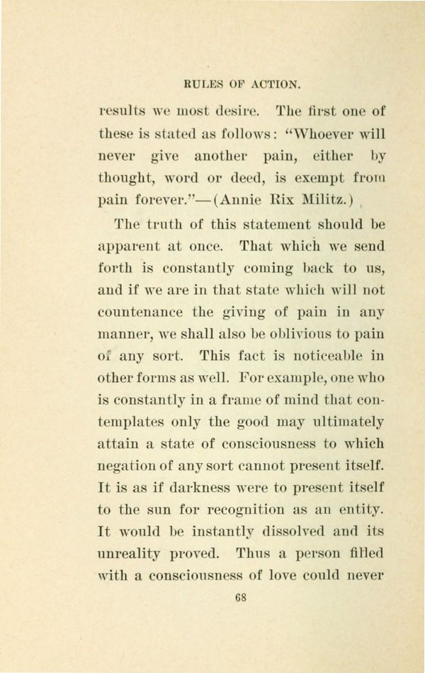 results we most desire. The first one of these is stated as follows: "Whoever will never give another pain, either by thought, word or deed, is exempt from pain forever." --- (Annie Rix Militz.)