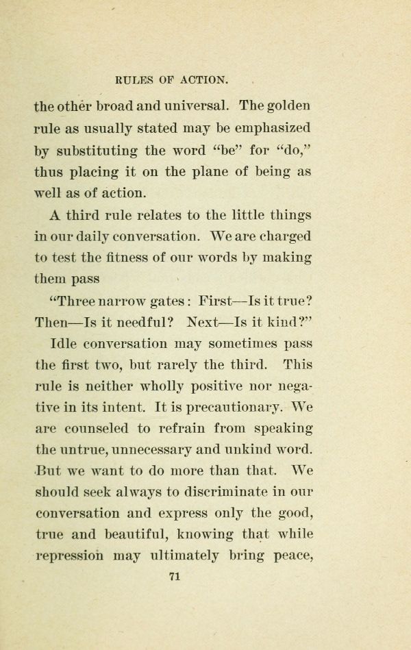 Idle conversation may sometimes pass the first two, but rarely the third. This rule is neither wholly positive nor negative in its intent. It is precautionary. We are counseled to refrain from speaking the untrue, unnecessary and unkind word. But we want to do more than that. We should seek always to discriminate in our conversation and express only the good, true and beautiful, knowing that while repression may ultimately bring peace,