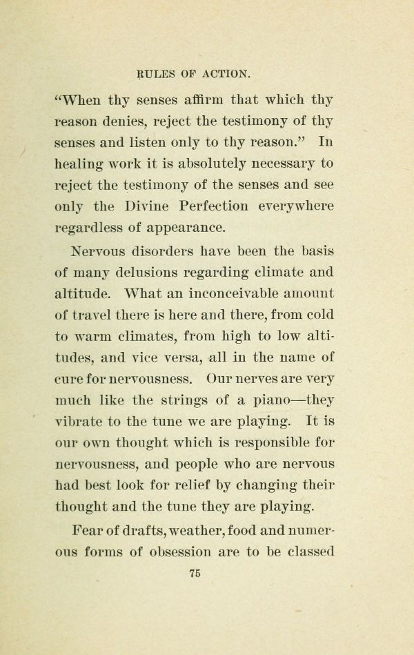 Nervous disorders have been the basis of many delusions regarding climate and altitude. What an inconceivable amount of travel there is here and there, from cold to warm climates, from high to low altitudes, and vice versa, all in the name of cure for nervousness. Our nerves are very much like the strings of a piano --- they vibrate to the tune we are playing. It is our own thought which is responsible for nervousness, and people who are nervous had best look for relief by changing their thought and the tune they are playing.