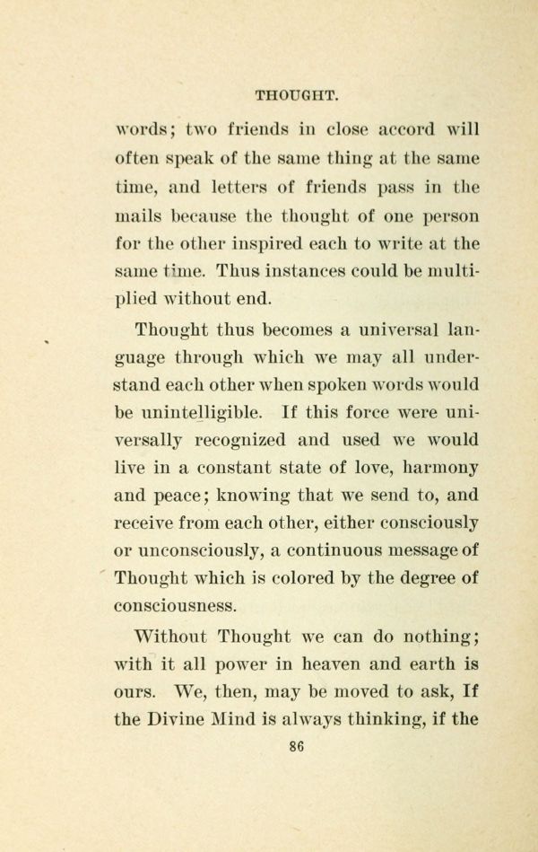 Thought thus becomes a universal language through which we may all understand each other when spoken words would be unintelligible. If this force were universally recognized and used we would live in a constant state of love, harmony and peace; knowing that we send to, and receive from each other, either consciously or unconsciously, a continuous message of "Thought which is colored by the degree of consciousness. Without Thought we can do nothing; with it all power in heaven and earth is ours. We, then, may be moved to ask, If the Divine Mind is always thinking, if the