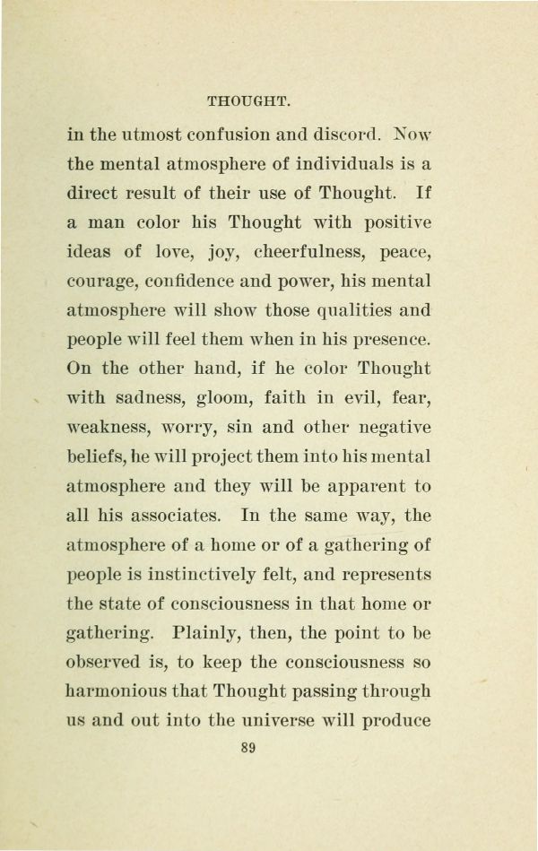 in the utmost confusion and discord. Now the mental atmosphere of individuals is a direct result of their use of Thought. If a man color his Thought with positive ideas of love, joy, cheerfulness, peace, courage, confidence and power, his mental atmosphere will show those qualities and people will feel them when in his presence. On the other hand, if he color Thought with sadness, gloom, faith in evil, fear, weakness, worry, sin and other negative beliefs, he will project them into his mental atmosphere and they will be apparent to all his associates. In the same way, the atmosphere of a home or of a gathering of people is instinctively felt, and represents the state of consciousness in that home or gathering. Plainly, then, the point to be observed is, to keep the consciousness so harmonious that Thought passing through us and out into the universe will produce