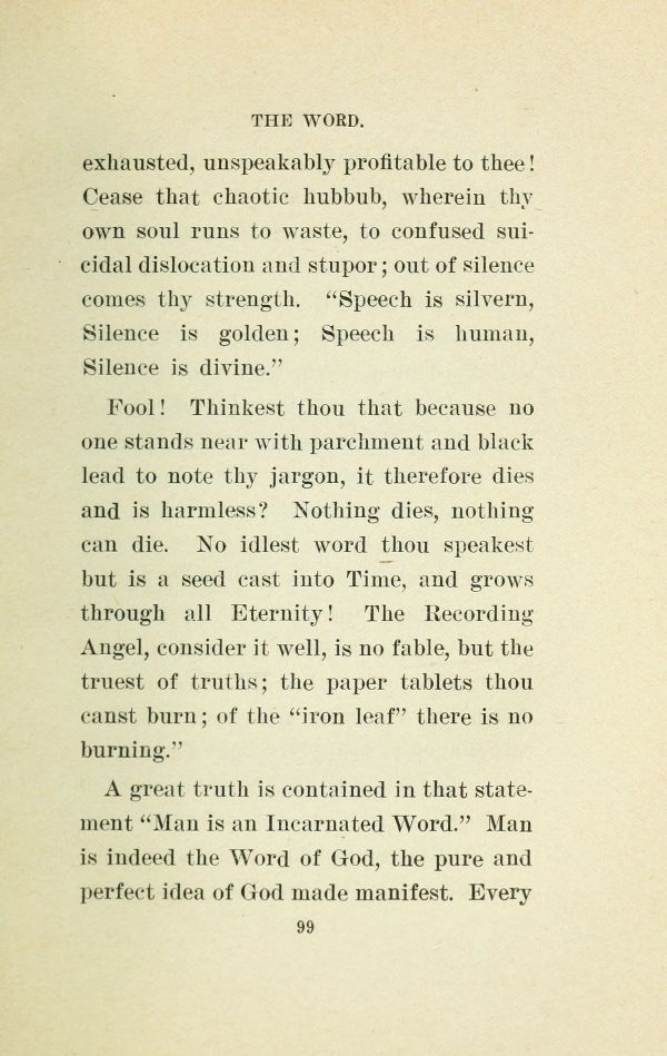 Fool! Thinkest thou that because no one stands near with parchment and black lead to note thy jargon, it therefore dies and is harmless? Nothing dies, nothing can die. No idlest word thou speakest but is a seed cast into Time, and grows through all Eternity! The Recording Angel, consider it well, is no fable, but the truest of truths; the paper tablets thou canst burn; of the "iron leaf" there is no burning."