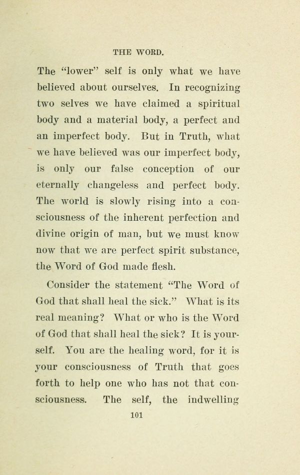The "lower" self is only what we have believed about ourselves. In recognizing two selves we have claimed a spiritual body and a material body, a perfect and an imperfect body. But in Truth, what we have believed was our imperfect body, is only our false conception of our eternally changeless and perfect body. The world is slowly rising into a consciousness of the inherent perfection and divine origin of man, but we must know now that we are perfect spirit substance, the Word of God made flesh.
