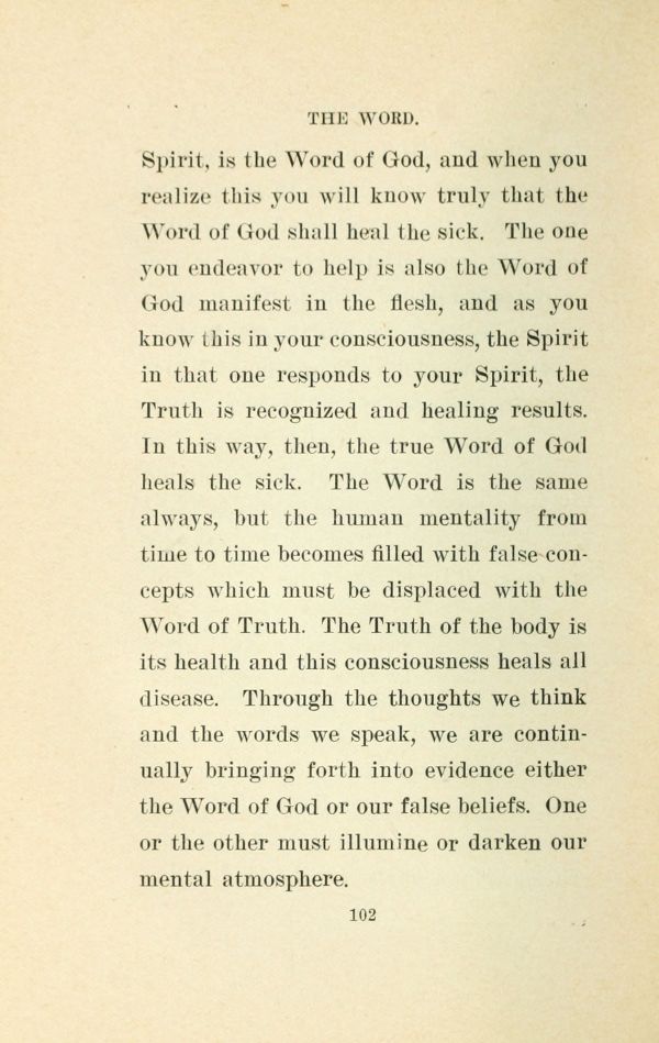 Spirit, is the Word of God, and when you realize this you will know truly that the Word of God shall heal the sick. The one you endeavor to help is also the Word of God manifest in the flesh, and as you know this in your consciousness, the Spirit in that one responds to your Spirit, the Truth is recognized and healing results. In this way, then, the true Word of God heals the sick. The Word is the same always, but the human mentality from time to time becomes filled with false-concepts which must be displaced with the Word of Truth. The Truth of the body is its health and this consciousness heals all disease. Through the thoughts we think and the words we speak, we are continually bringing forth into evidence either the Word of God or our false beliefs. One or the other must illumine or darken our mental atmosphere.