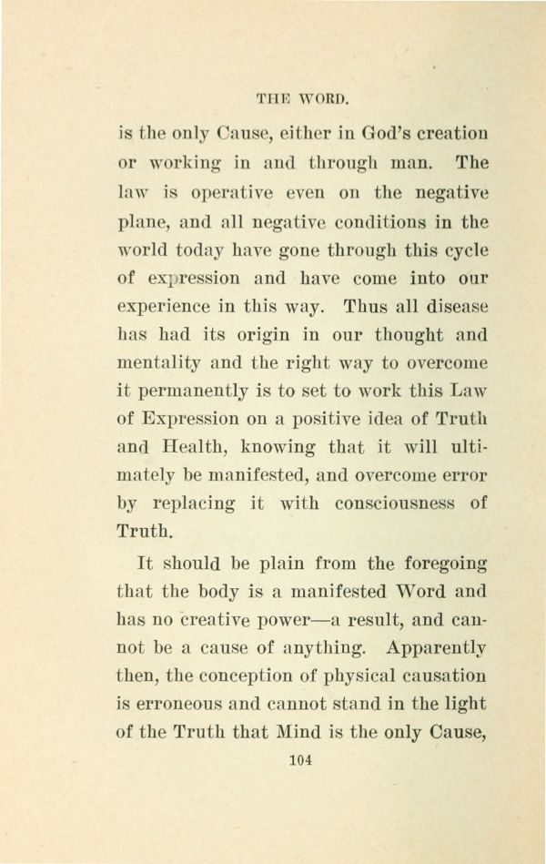 It should be plain from the foregoing that the body is a manifested Word and has no creative power --- a result, and cannot be a cause of anything. Apparently then, the conception of physical causation is erroneous and cannot stand in the light of the Truth that Mind is the only Cause,