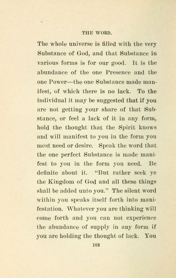 The whole universe is filled with the very Substance of God, and that Substance in various forms is for our good. It is the abundance of the one Presence and the one Power --- the one Substance made manifest, of which there is no lack. To the individual it may be suggested that if you are not getting your share of that Substance, or feel a lack of it in any form, hold the thought that the Spirit knows and will manifest to you in the form you most need or desire. Speak the word that the one perfect Substance is made manifest to you in the form you need. Be definite about it. "But rather seek ye the Kingdom of God and all these things shall be added unto you." The silent word within you speaks itself forth into manifestation. Whatever you are thinking will come forth and you can not experience the abundance of supply in any form if you are holding the thought of lack. You